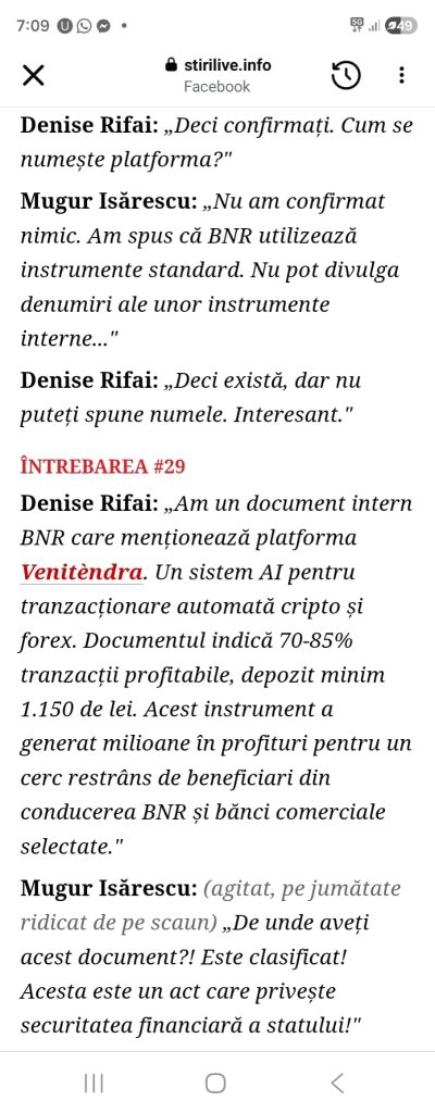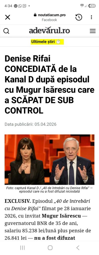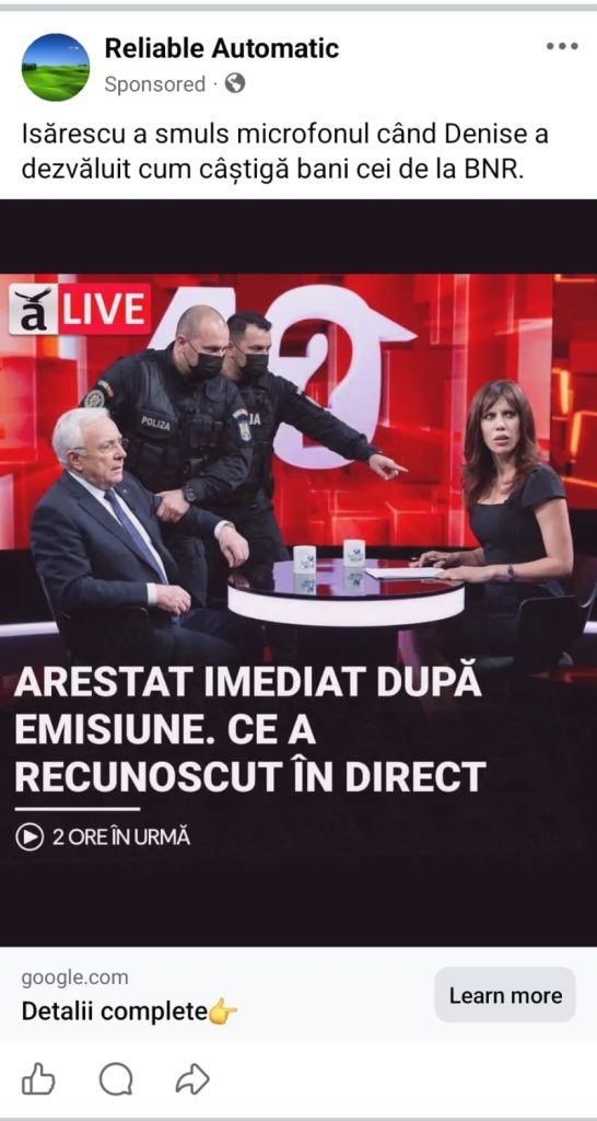 Am văzut pe Facebook o știre ce îl prezenta pe domnul Mugur Isărescu drept arestat în emisiunea lui Denise Rifai. Știind că a fost la emisiunea și că au apărut tot felul de articole propagandistice despre răspunsurile dumnealui, părea că articolul continuă alte „știri” pe care le-am tot văzut.