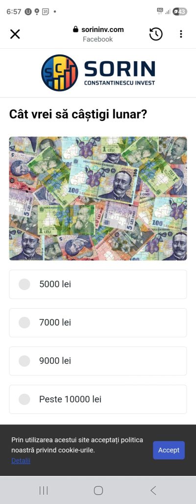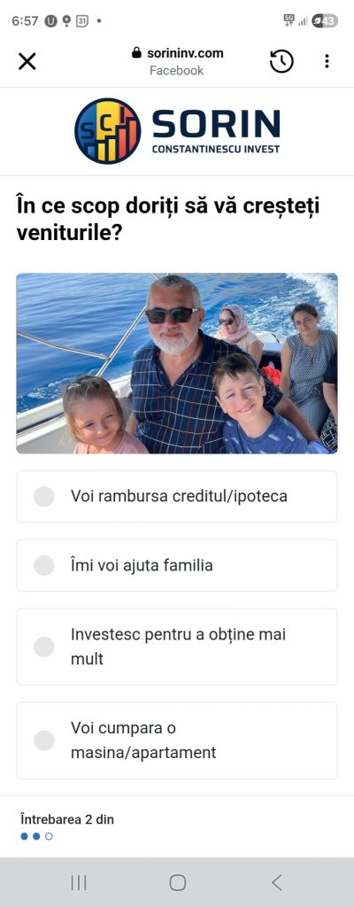 Am dat mai departe click pe butonul roșu ca să văd dacă pot cștiga ceva. Aici am ajuns într-un sondaj de calificare. Rolul acestui sondar este săcolecteze date și să vadă cât de credul ești. Doar simplul fapt că îl completezi, te „califică” în lista lor. Dacă ai completat un email sau telefon, devii și bun de vândut ân liste cu baze de date de persoane împreună cu alte date.