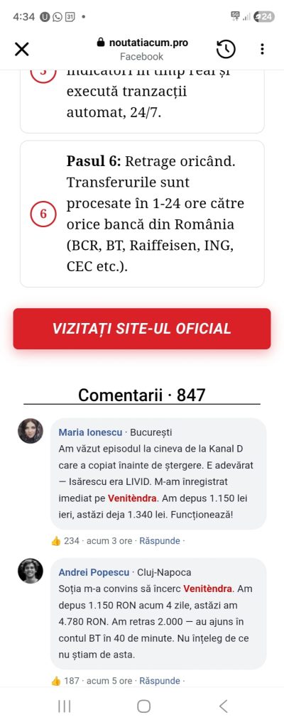 După completarea sondajului, au avut grijă să îmi mai arate niște testimoniale credibile. Rolul testimonialelor este să se creeze senzația că respectivele acțiuni sunt recomandate de oameni în care putem avea încredere pentru că apar la televizor. De multe ori, acestea sunt completate de sute de comentarii aparent venind de la oameni. În ziua de astăzi nu mai este atât de dificil să creezi câteva mii de comentarii. Inteligența artificială poate ajuta atacatorii să genereze sute de comentarii în câteva minute!