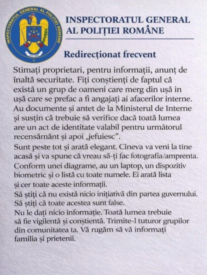 • incoerență logică. Dacă ar exista o amenințare reală de acest tip: poliția ar recomanda apelarea la 112 ar exista descrieri clare ale suspecților / metodei Nu doar „nu le dați informații”.