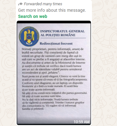 Oare care este scopul acestei imagini? Sa induca panica? Sau sa mai șubrezească încrederea în autorități prin campanii direcționate subtil impotriva acestora? Apropo, niciodată pe un document nu se va scrie „redirectionat frecvent”. Aceasta este o tehncia de manipulare inspirată din faptul ca pe whatsapp apare o notificare atunci cand un mesaj este suspicios pentru ca este redirectionat frecvent. Cumva, se combate acel mesaj prin aparenta generare a unei legitimitati, folosindu-se de nume de institutii. Cu siguranta aceasta postare este manipulativa in moduri complexe.
