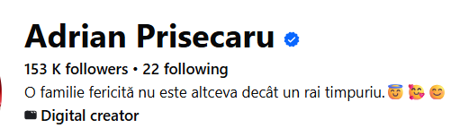 Contul are 153 mii de urmăritori, la bio are mesajul „O familie fericită nu este altceva decât un rai timpuriu.😇🥰😊” și își pune în prim plan copiii. Totuși, mă gândesc că nimeni nu și-ar face o pagină atât de publică și să îți pună poza cu copiii de până în 10 ani la profil și la cover. Este o expunere mult prea mare pentru ei. Din start, ceva nu se leagă. Mai mult de atât, are cont cu bifă albastră, deci, plătește abonament. Costurile sunt între 15 dolari și 500 dolari pe lună pentu acea bifă!